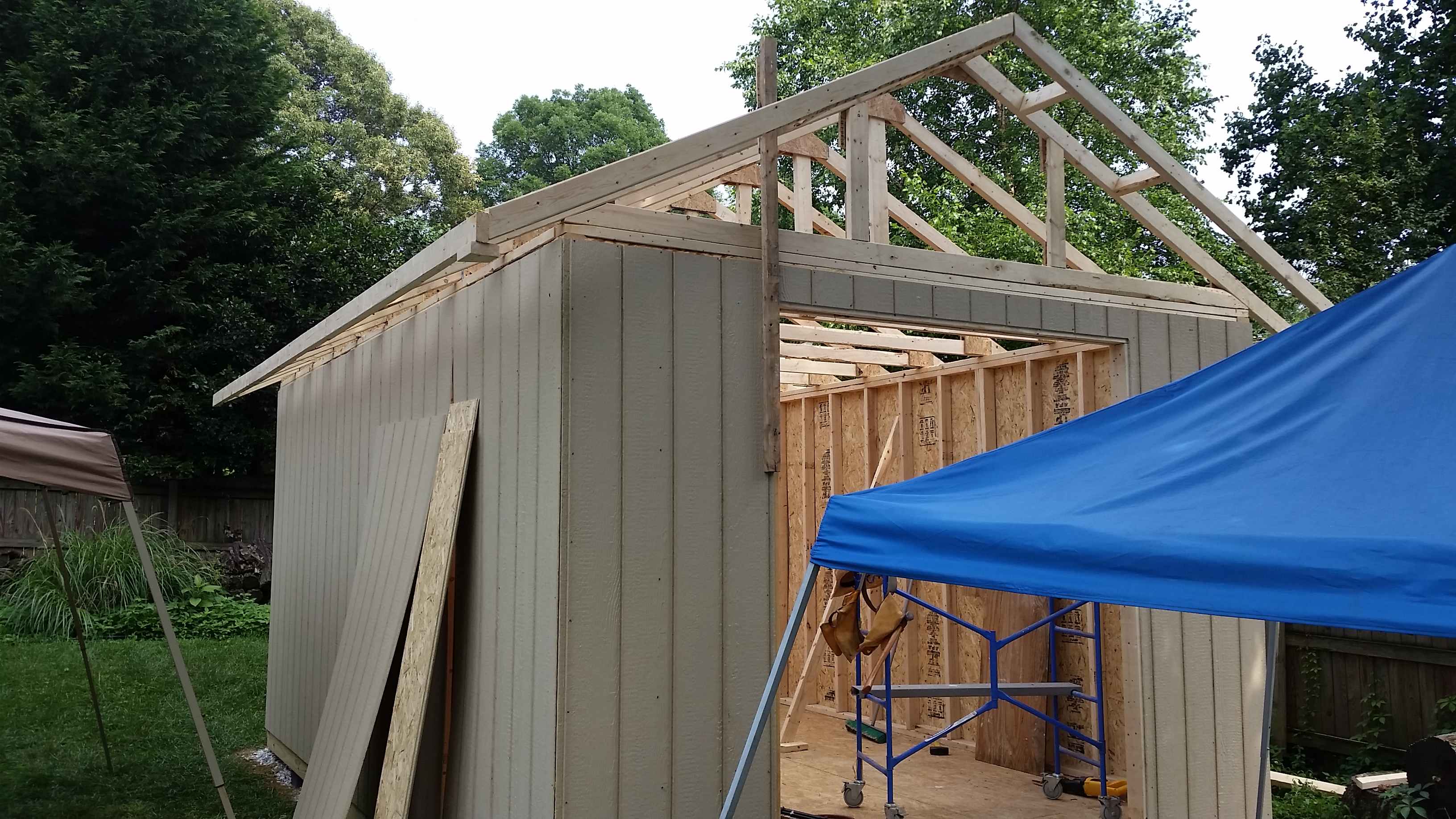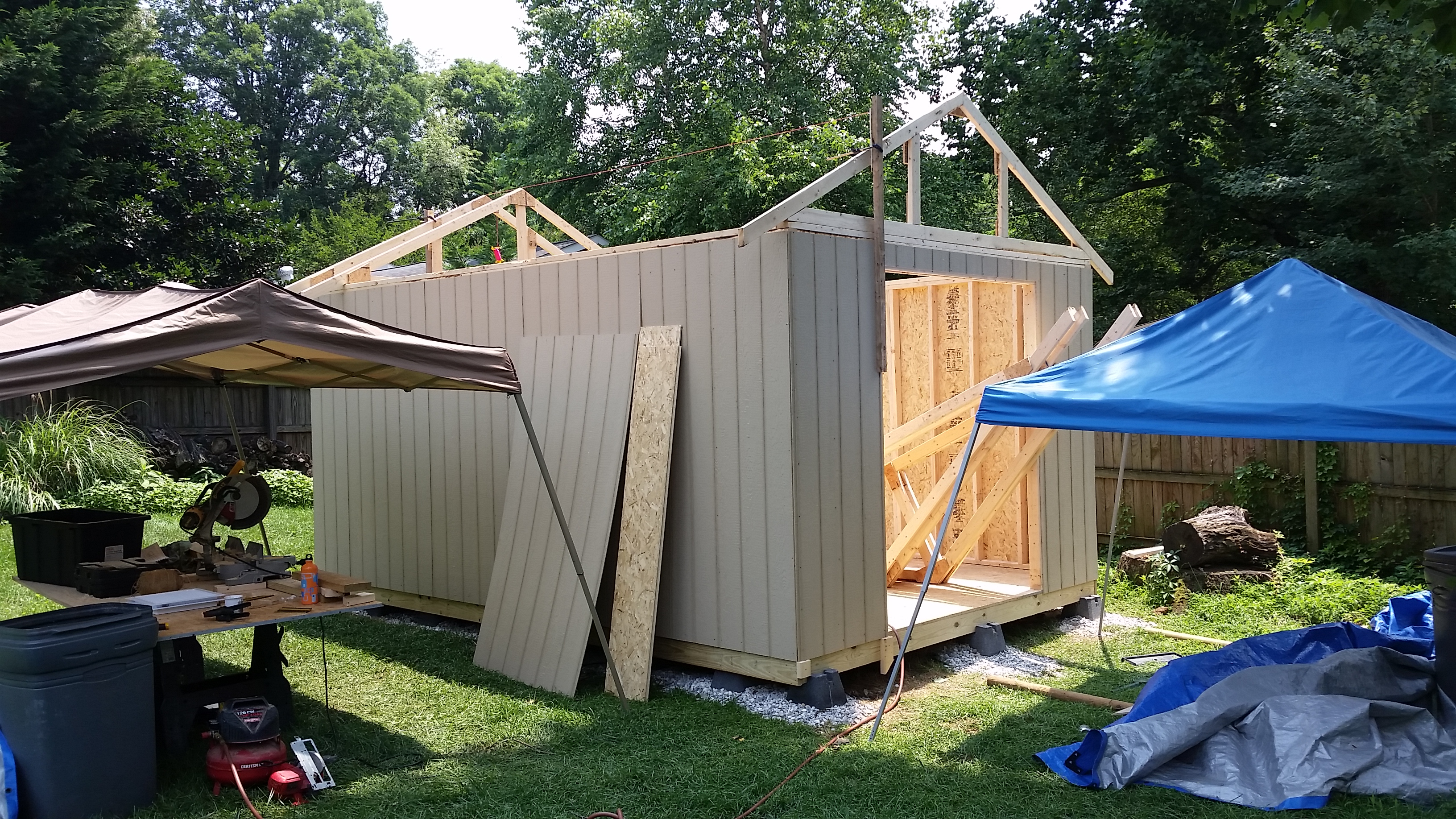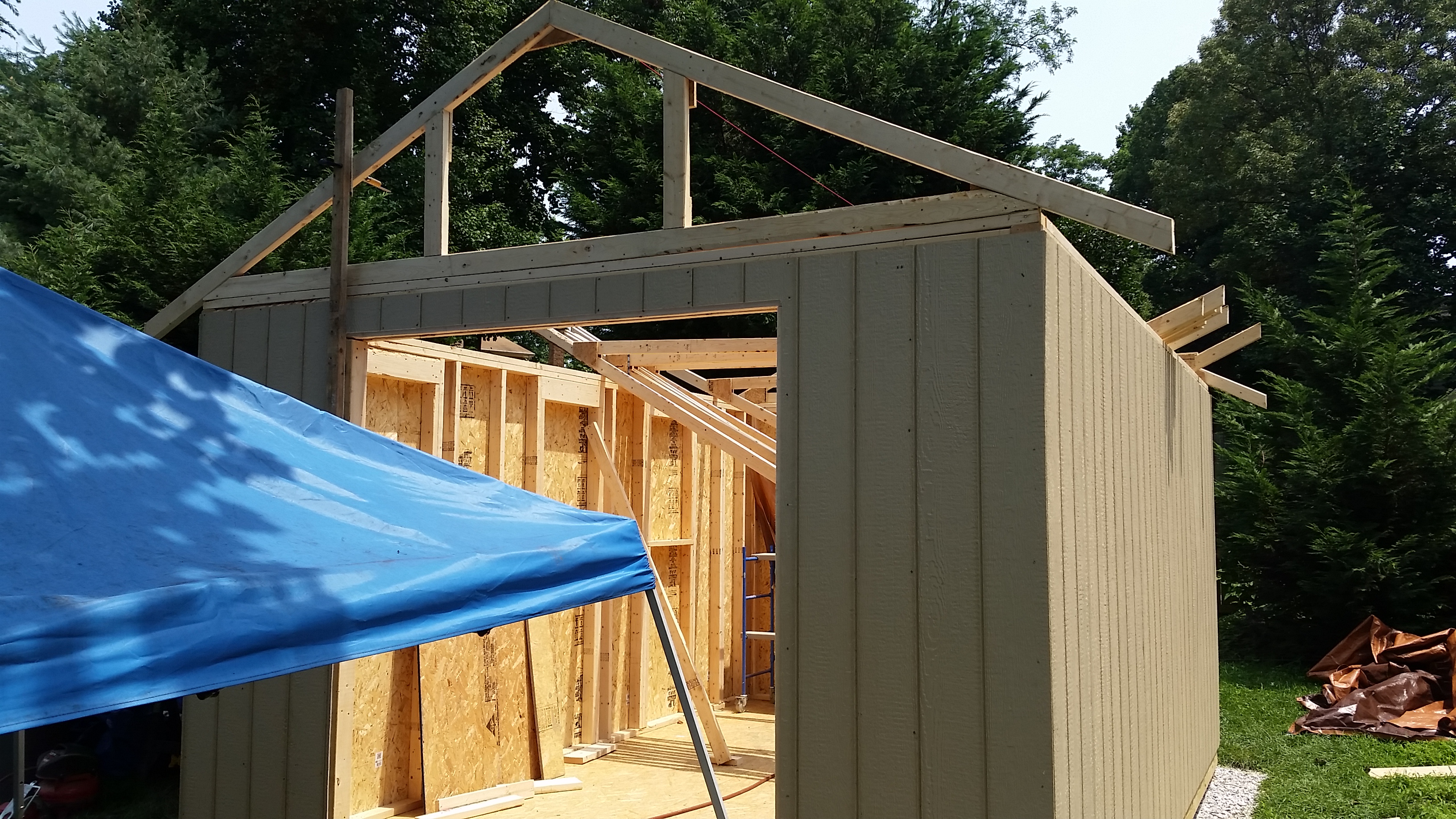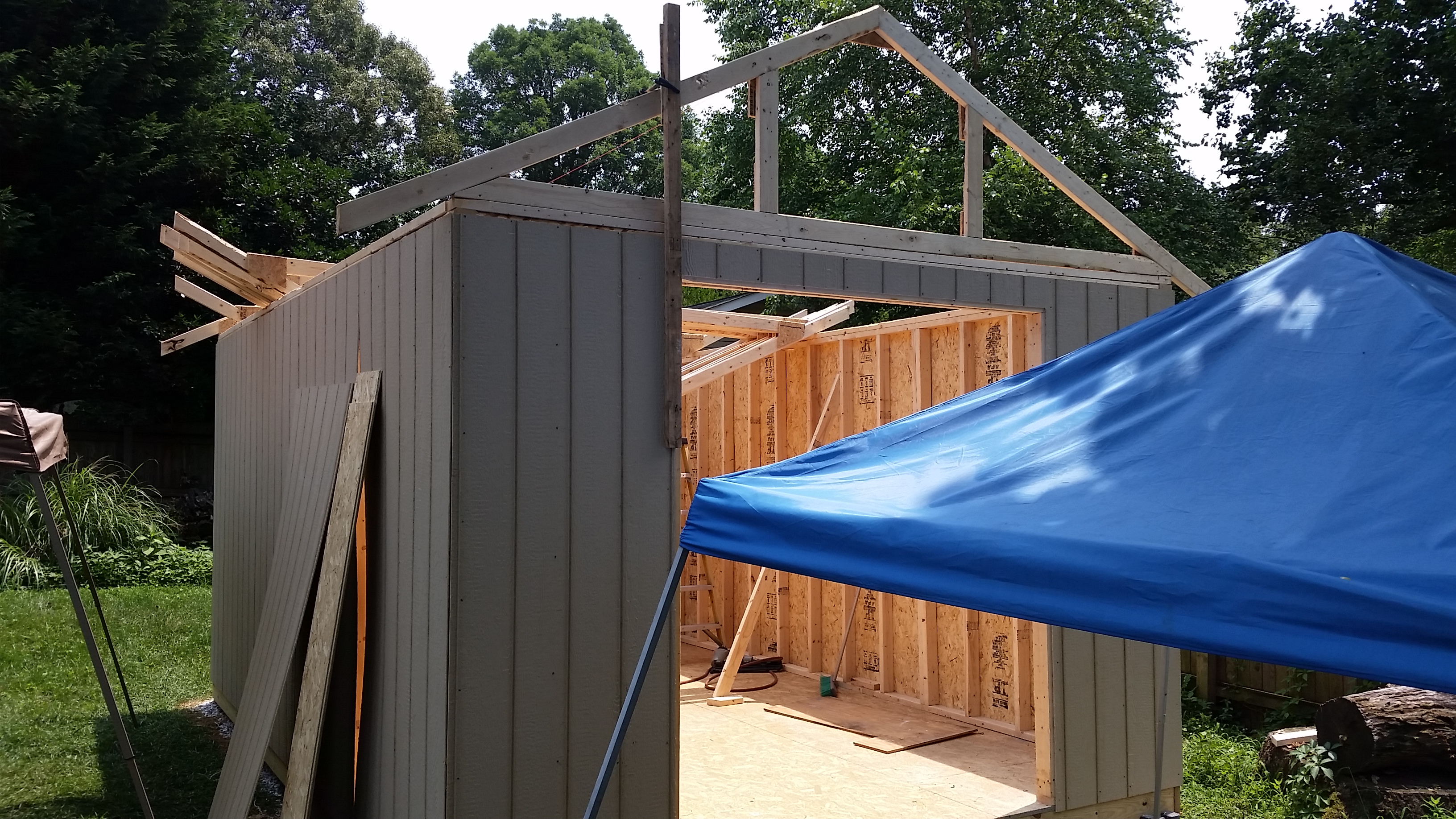 The holiday weekend was 3 days and I took an additional day off from work to get as much as possible completed. I was still delayed during that time considering it rained most of the day on Saturday, but overall I am very pleased with how much I finished up. I raised the walls on Friday (the two long ones I needed help from Brian to physically stand them up). Then came the rafters and finally the roof sheeting.