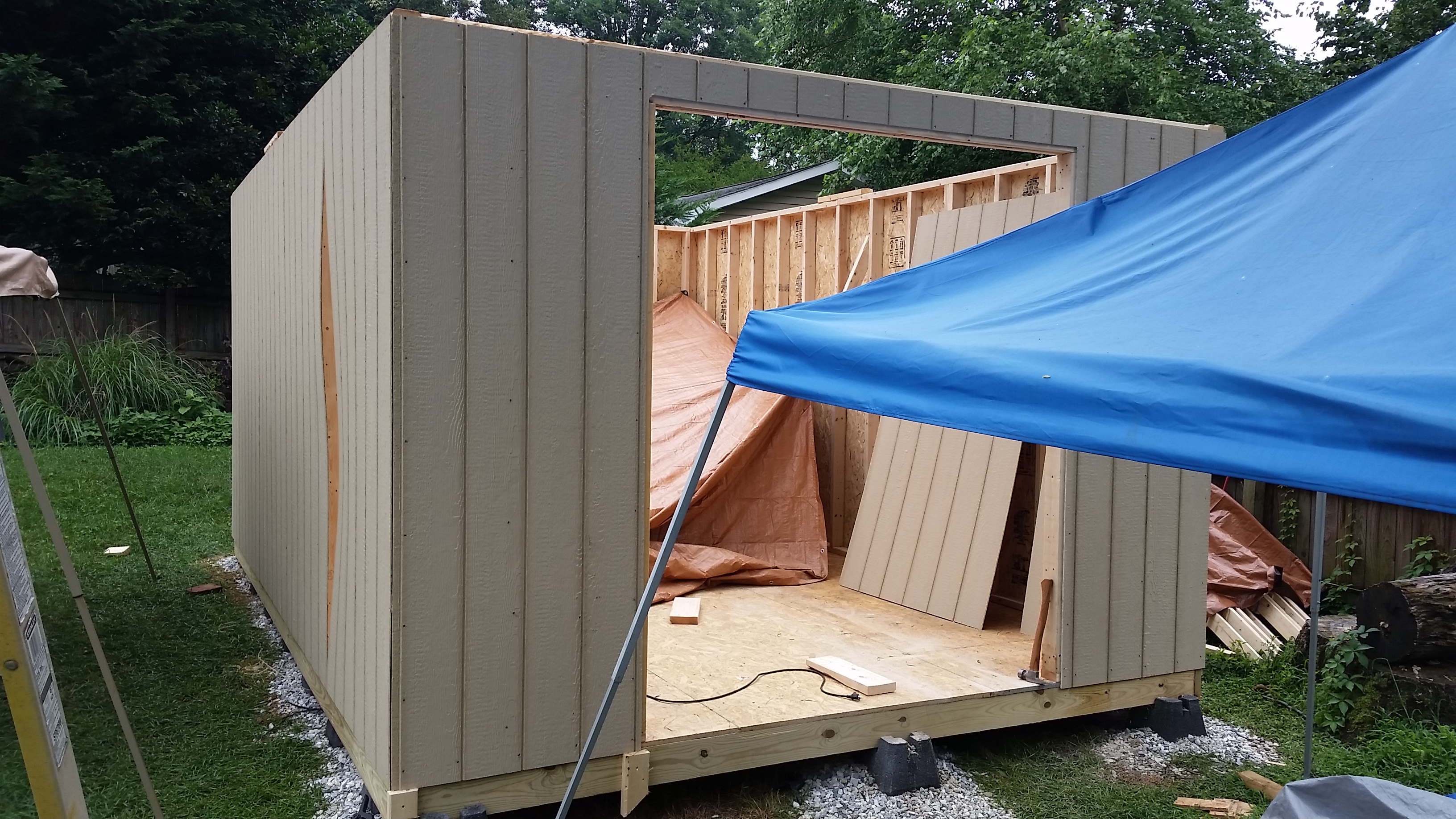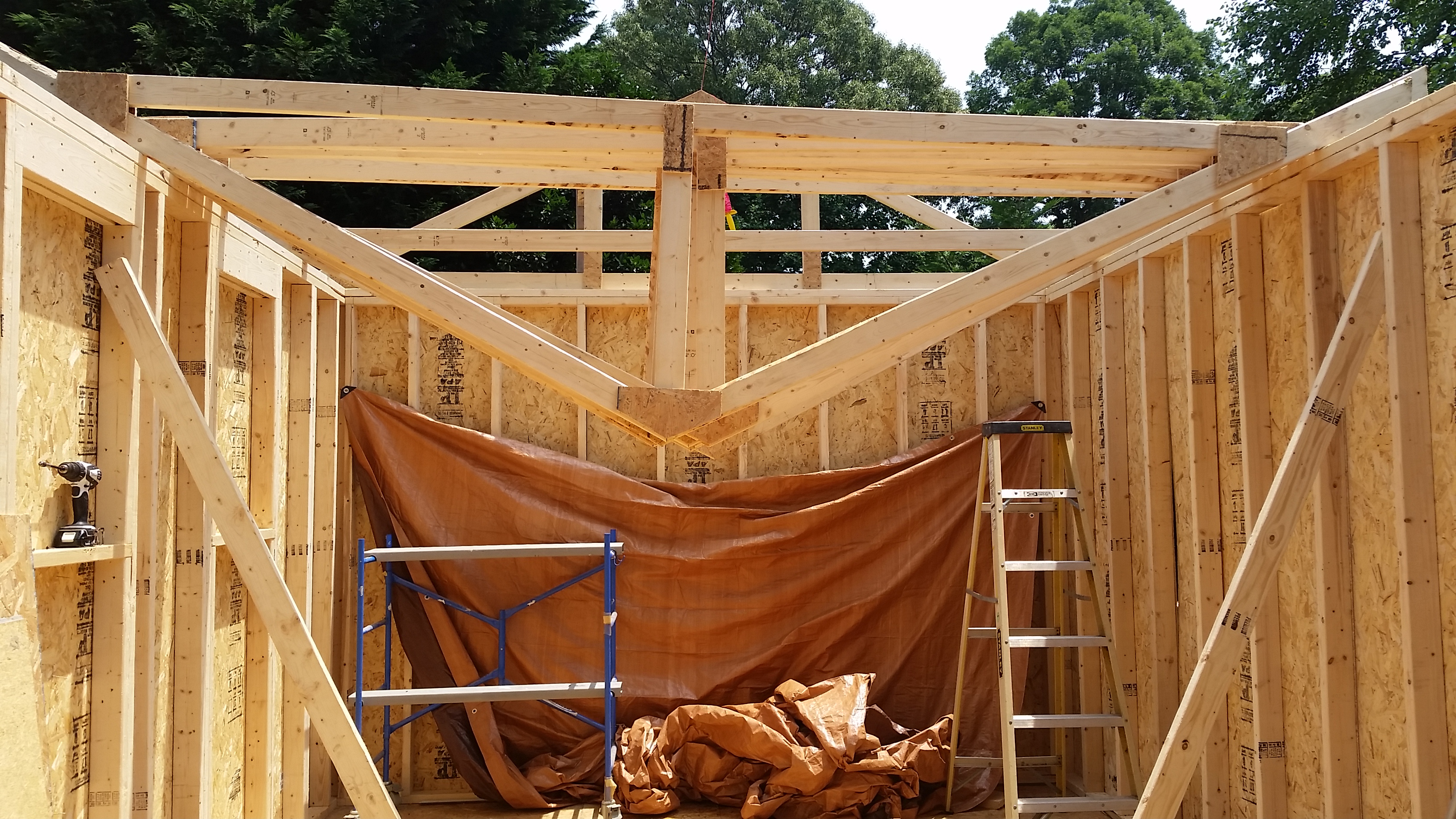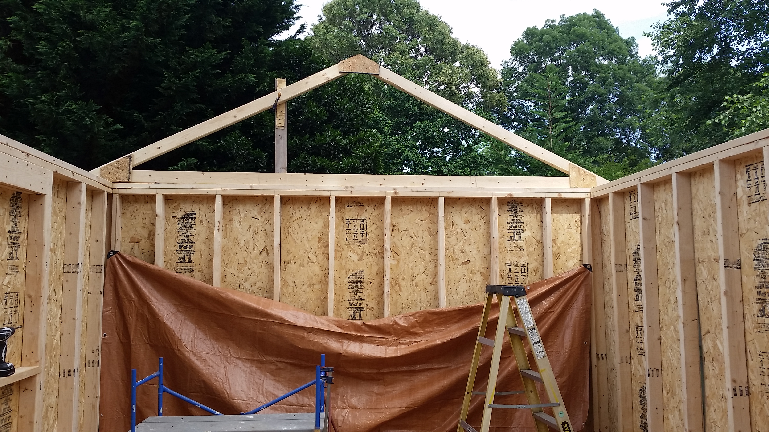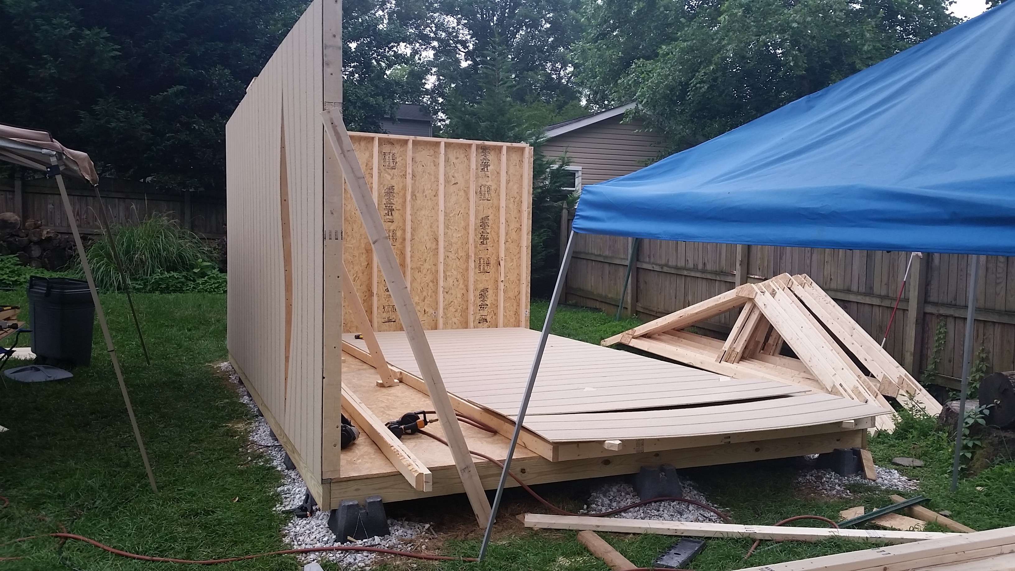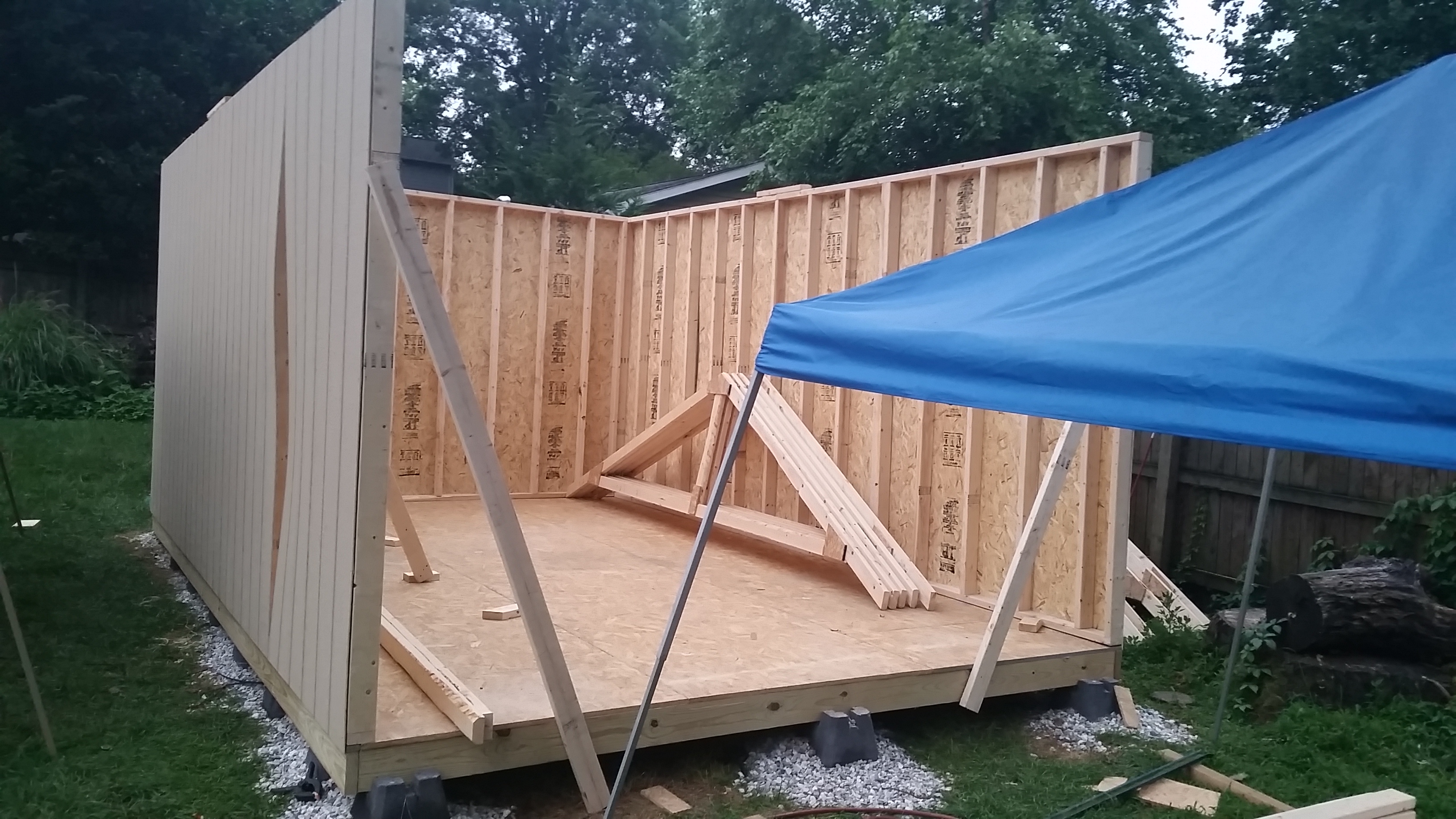 The holiday weekend was 3 days and I took an additional day off from work to get as much as possible completed. I was still delayed during that time considering it rained most of the day on Saturday, but overall I am very pleased with how much I finished up. I raised the walls on Friday (the two long ones I needed help from Brian to physically stand them up). Then came the rafters and finally the roof sheeting.