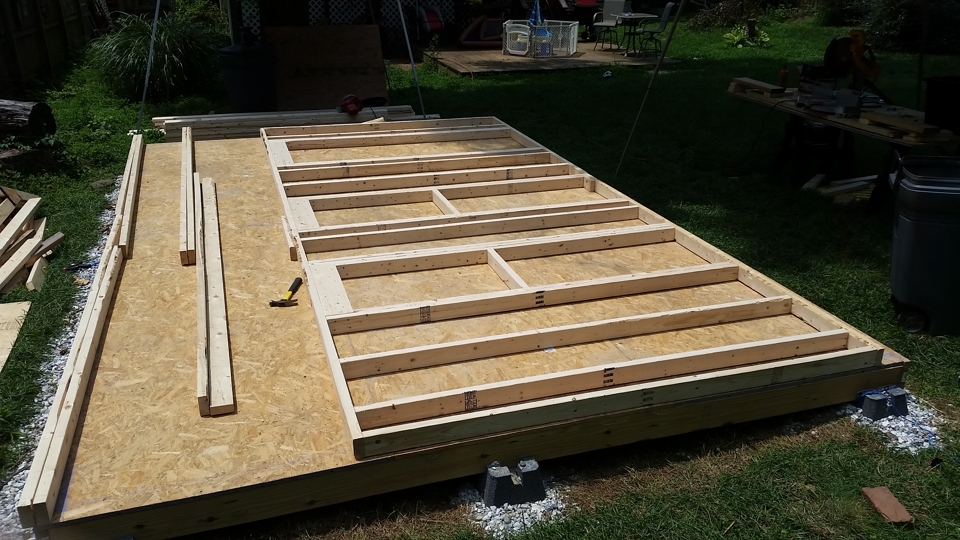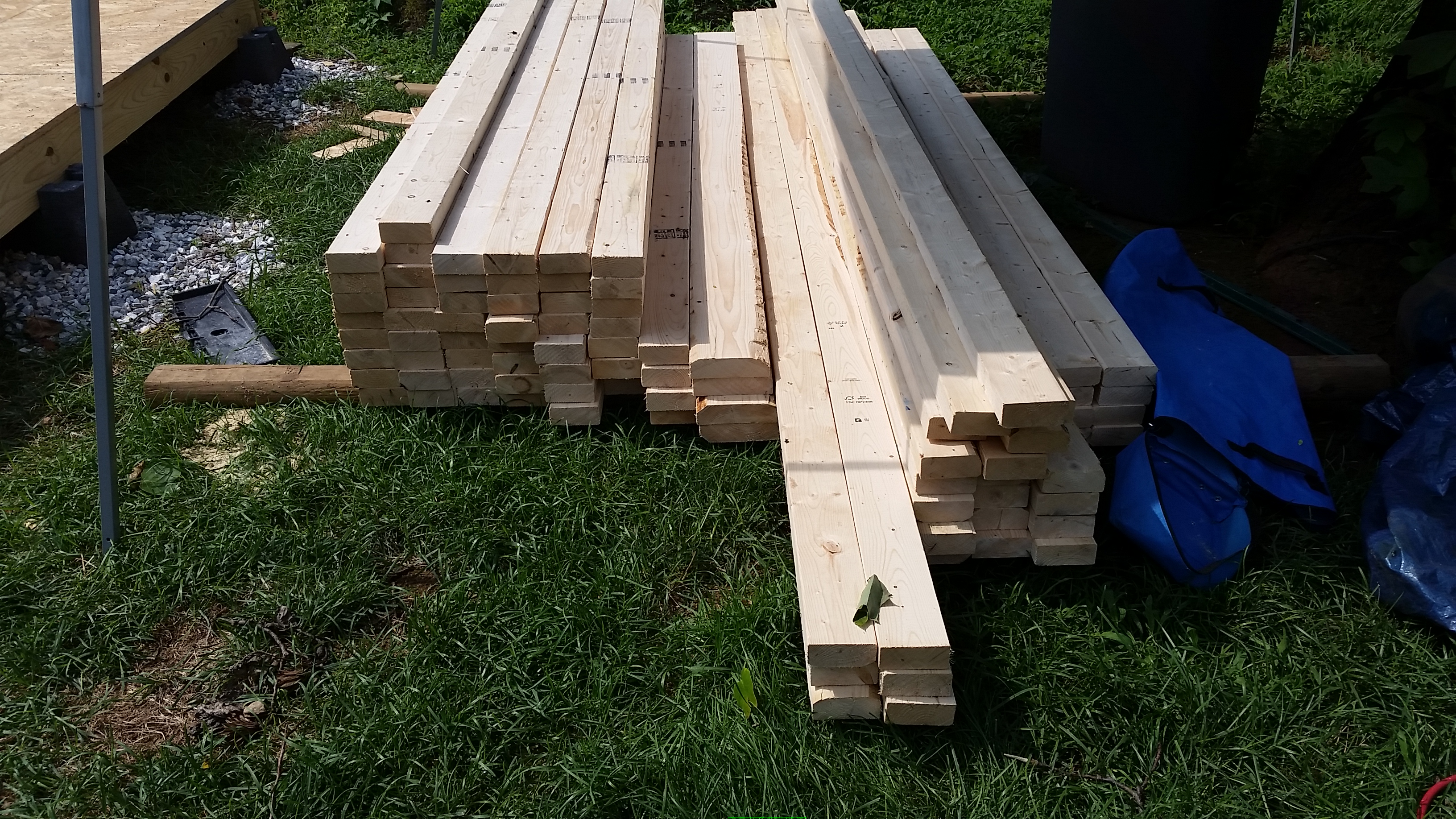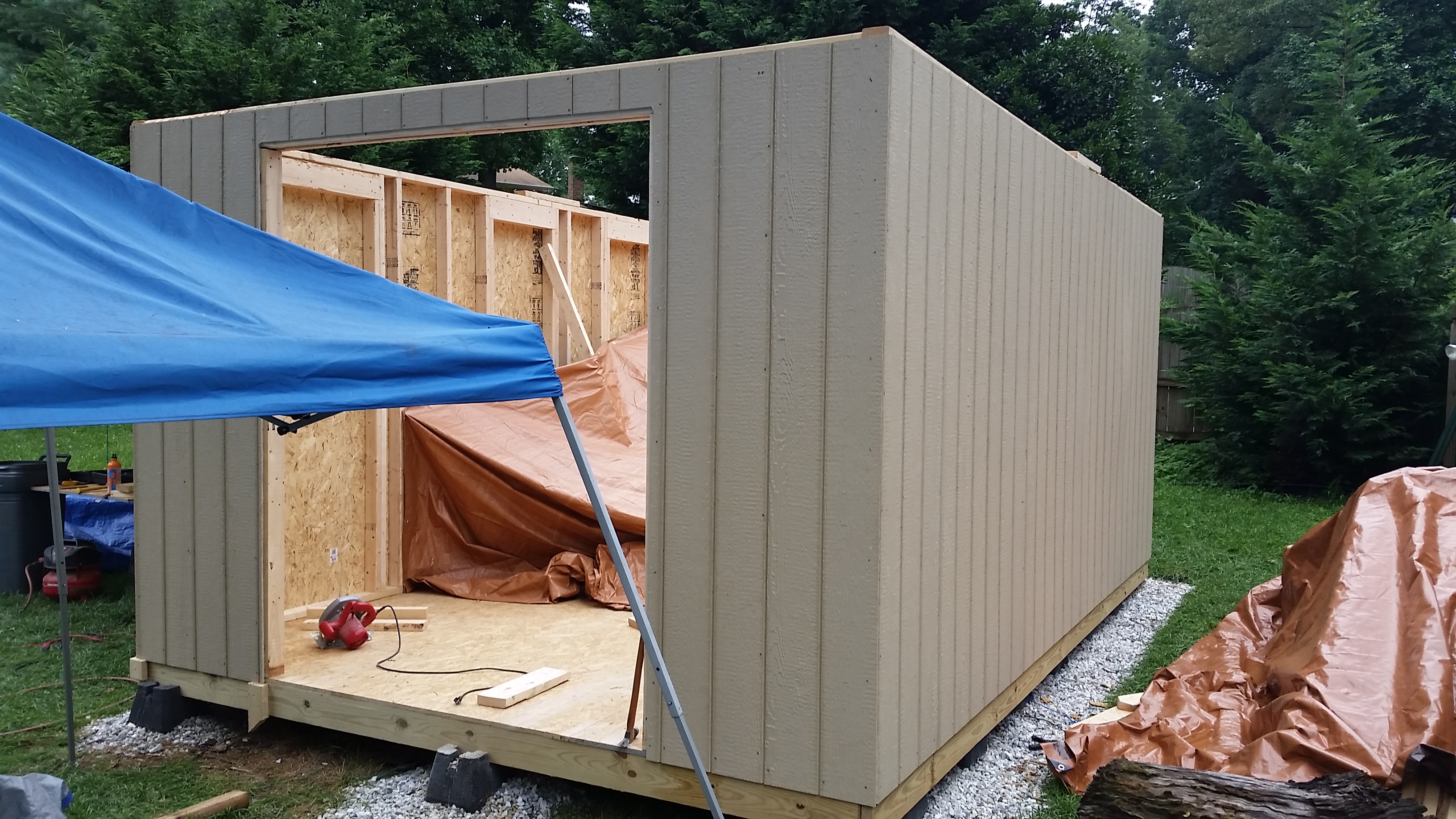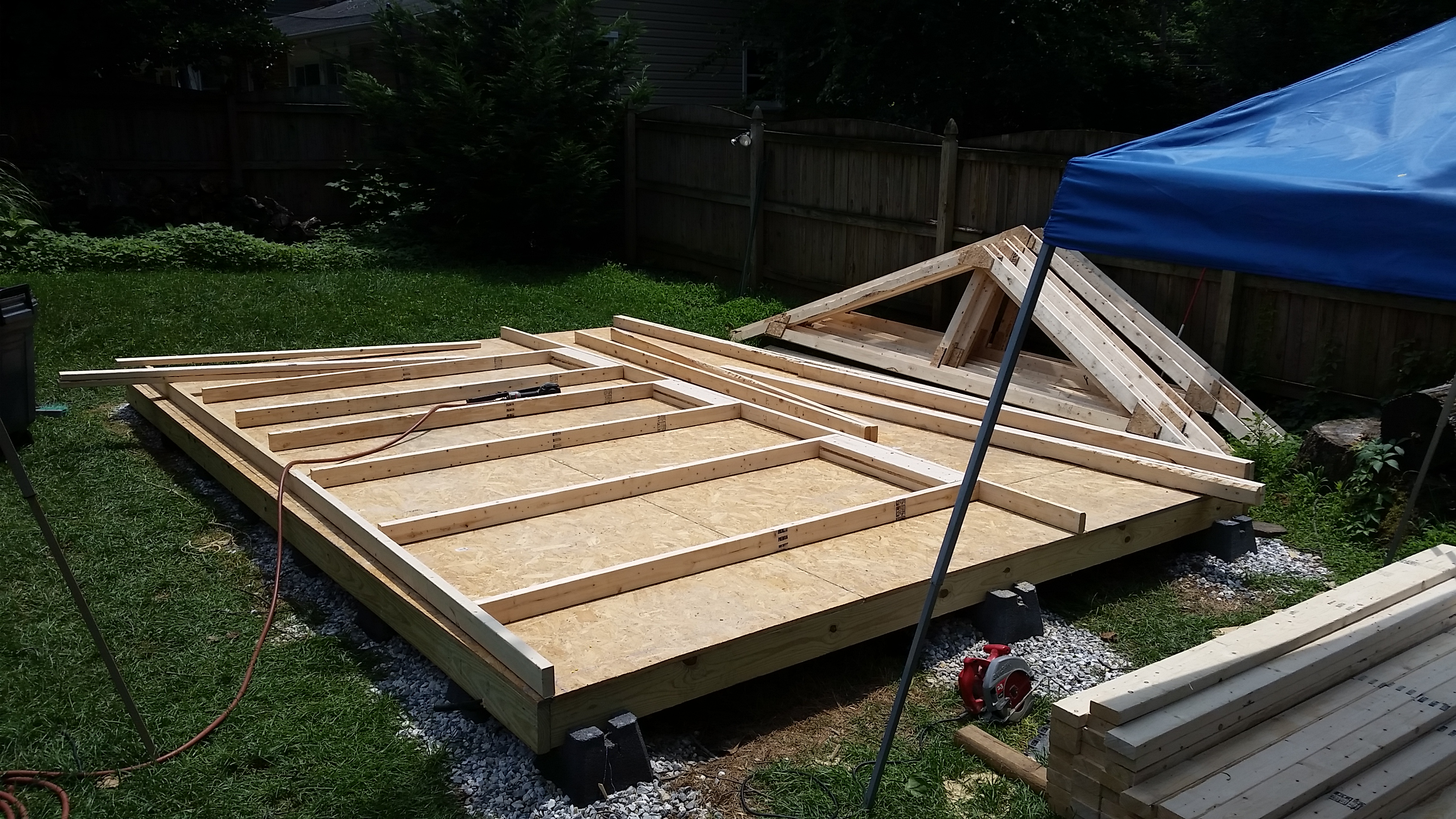 The holiday weekend was 3 days and I took an additional day off from work to get as much as possible completed. I was still delayed during that time considering it rained most of the day on Saturday, but overall I am very pleased with how much I finished up. I raised the walls on Friday (the two long ones I needed help from Brian to physically stand them up). Then came the rafters and finally the roof sheeting.