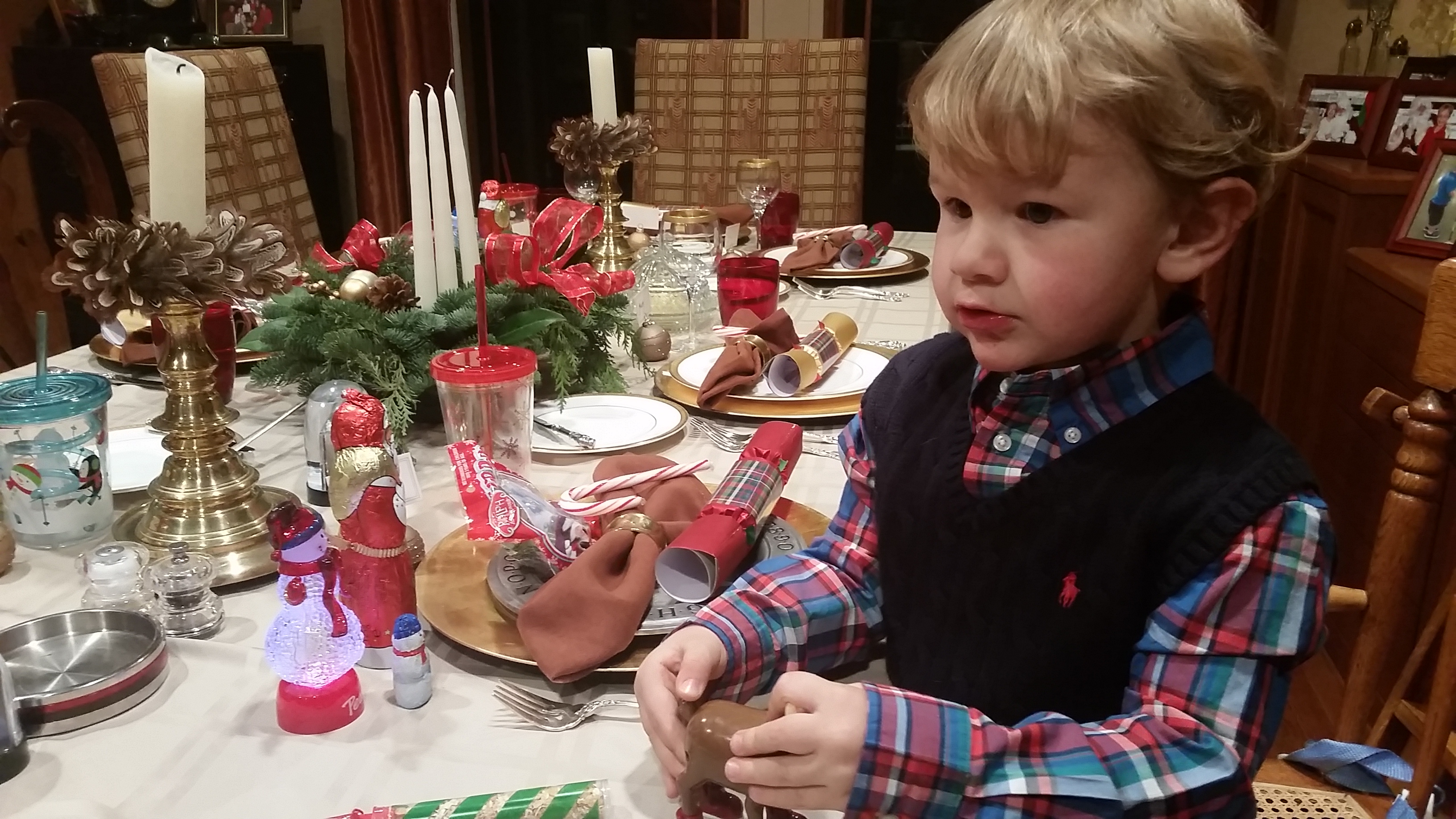 Over to John and Lois’ house early to help set up. Kris went even earlier than Ryder and I allowing him to maintain a somewhat normal nap schedule. Dinner was a little smaller than usual, with the Finleys, Fritz, Camille and the kids, Daryl and ourselves, all sitting at the big kid table. As always, it was a feast for the ages. We had to watch the clock carefully though as to not miss Santa on his route through Maryland. Our last mission of the night was the traditional reading of The Night Before Christmas as a family. Ryder sat in my lap and hung on every word.. exploring the pictures each time the book was passed before us.