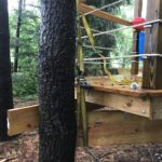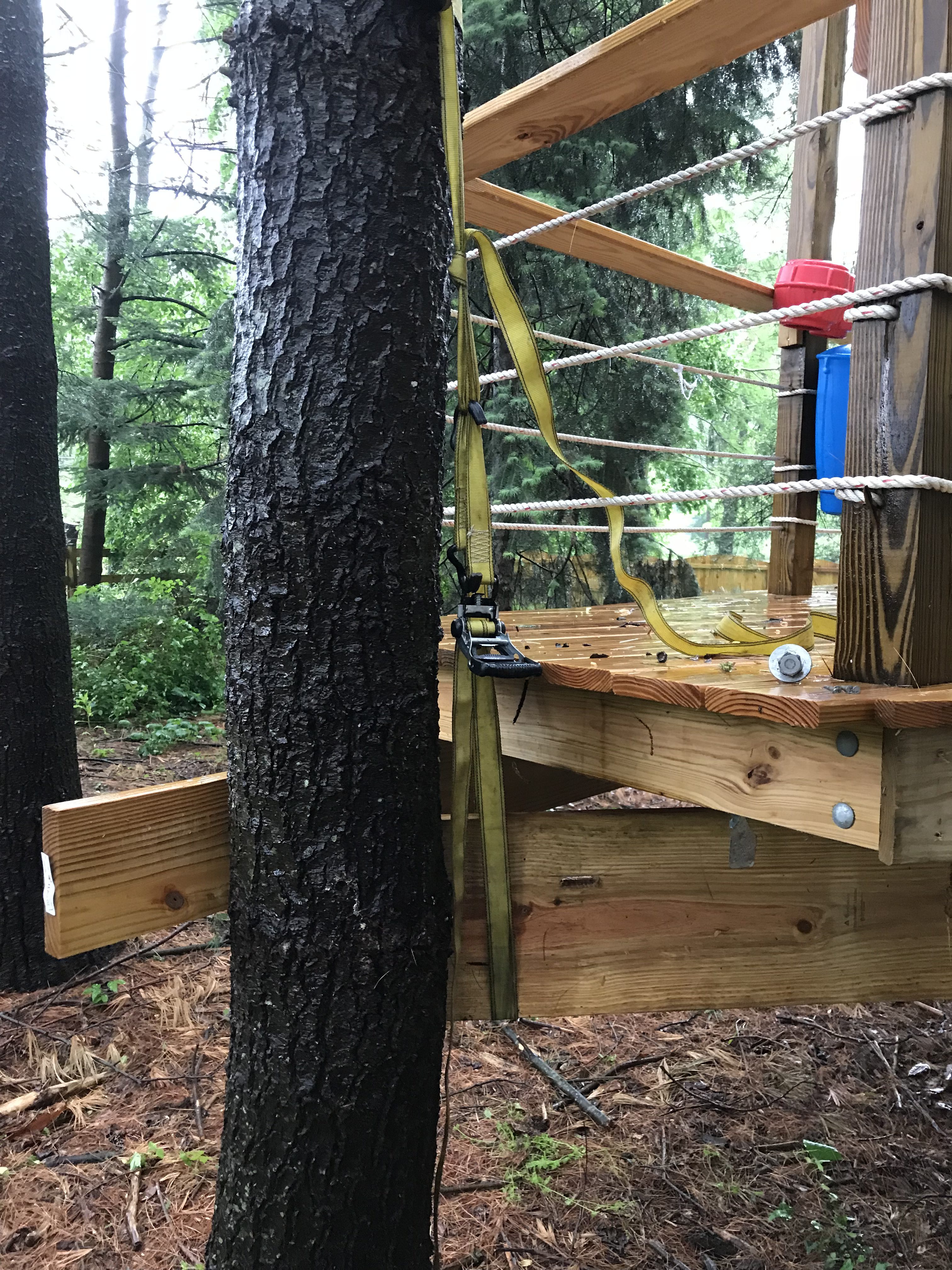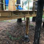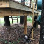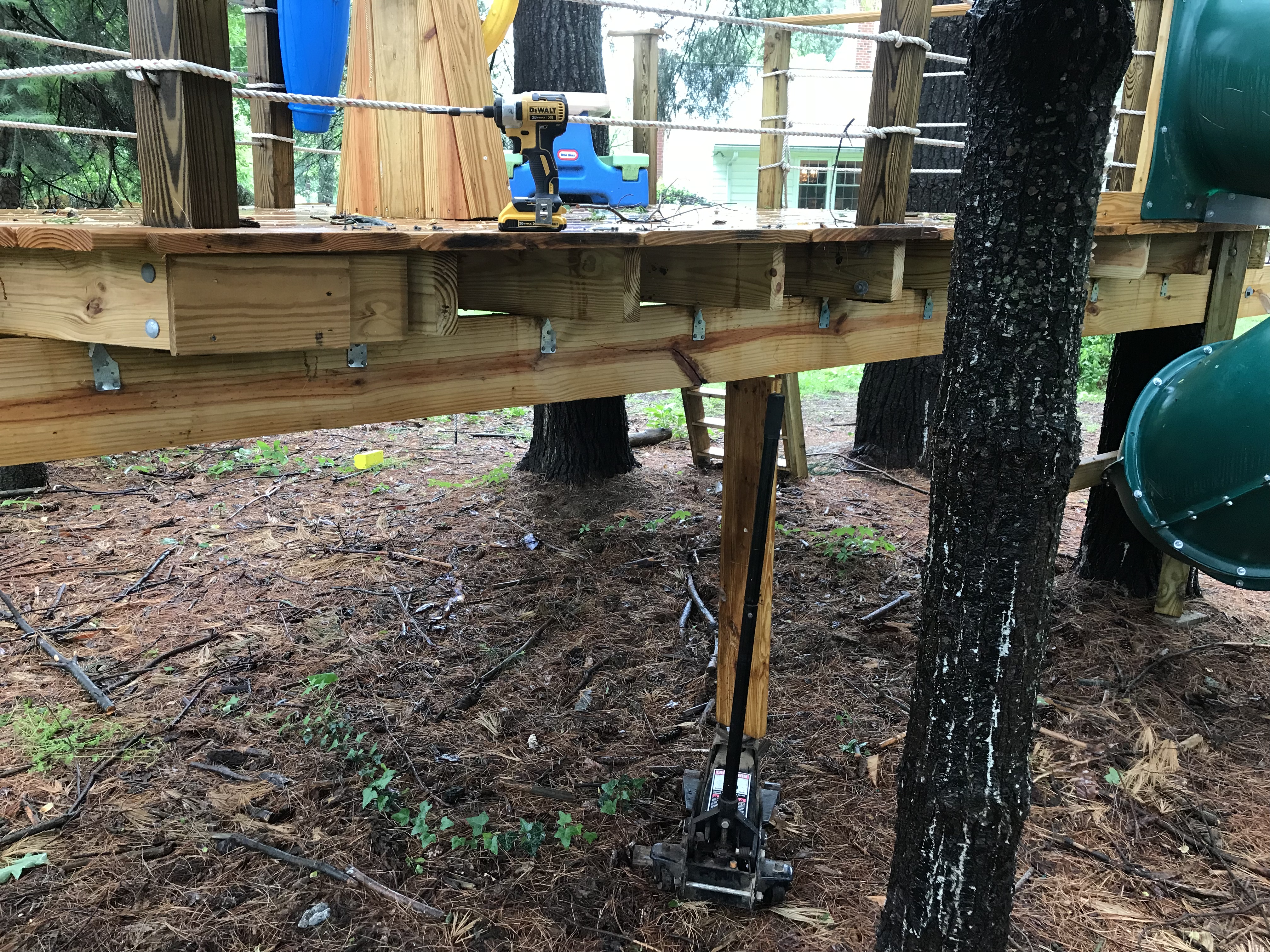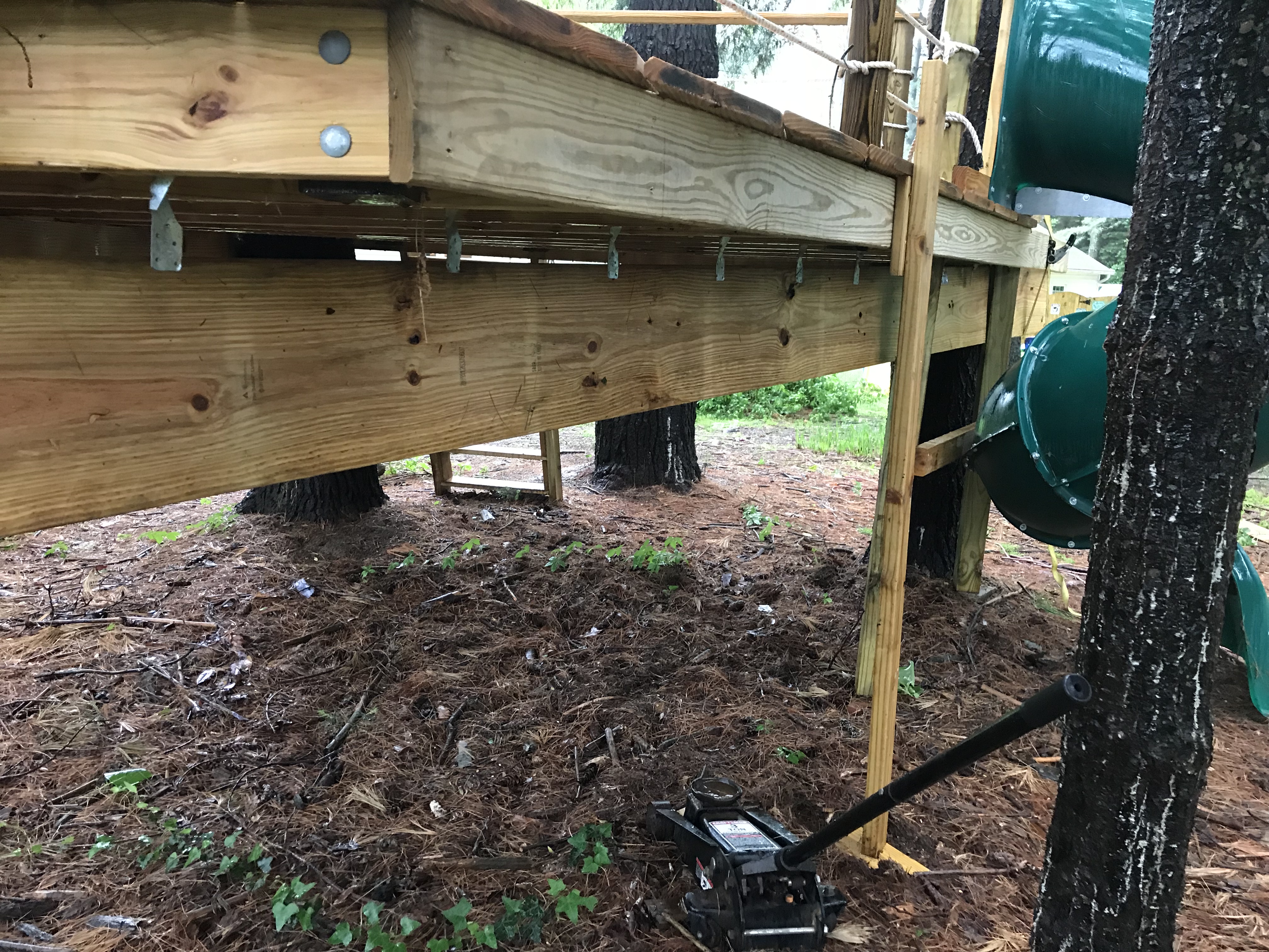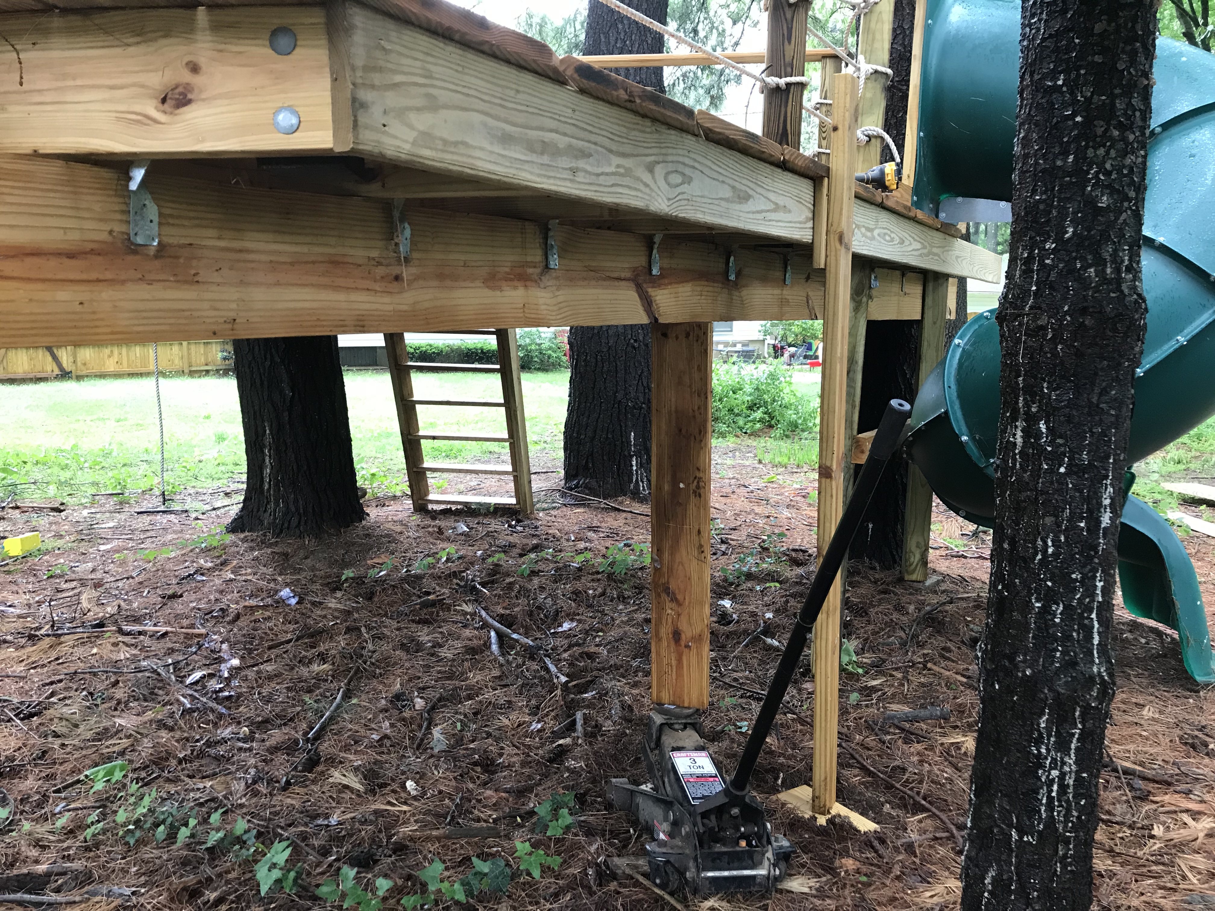 With only a day to spare, I was out in the rain attempting to weave a new much larger and heavier (this one weighs close to 150lbs) beam into place. I had to notch the slide support where it contoured the original, temporarily support the deck while I removed the broken beam and devise a way of hoisting the new one into place. My redneck engineering degree paid off and I’m confident this new system will support any and all kids that venture onto Ryder’s treehouse for years to come.