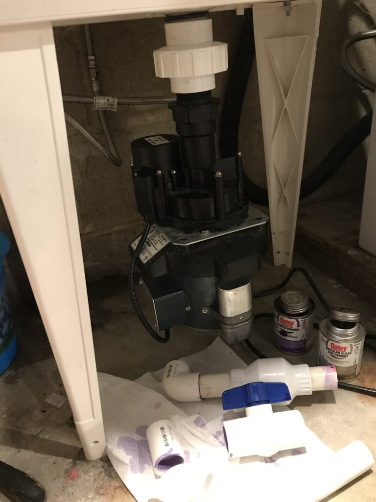 Insert sarcasm here. The laundry utility sink has a pump that hangs below the basin to lift water up to the outlet level in the basement. It’s a pretty common thing and so far has been pretty reliable, but it started acting a little funny about 4 months ago when a bunch off Ryder’s swimsuits were washed with a lot of beach sand. I’m guessing some of that debris wasn’t too kind to the internals of the pump. Fast forward back to present time (rather, a week ago) and I came home to the pump running constantly with no water in the sink. Ugh.