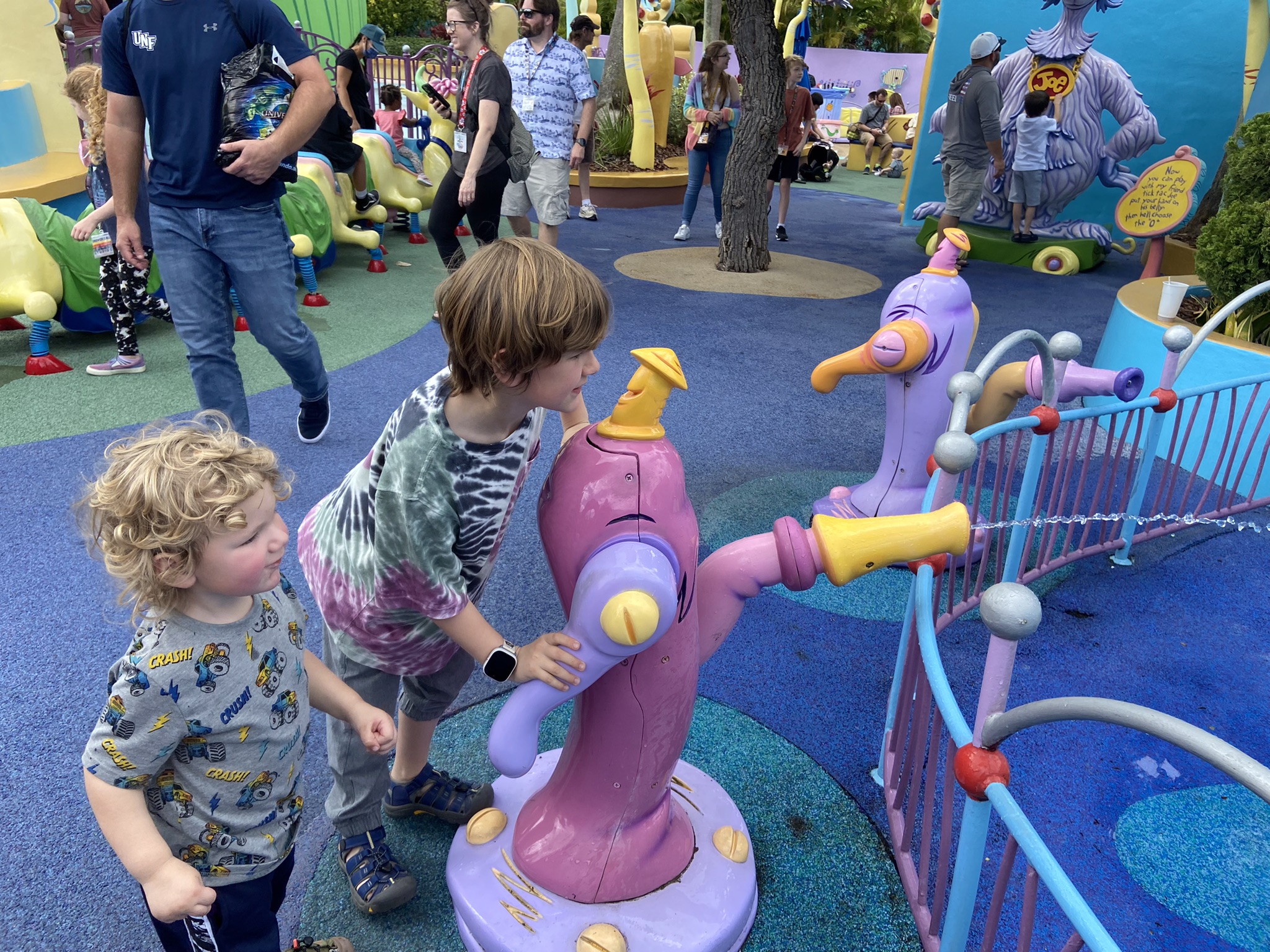 Day 1 (Monday) we headed to Universal Studios to break our legs in. The weather was perfect considering we left a snowstorm and freezing rain behind in Maryland. We rode several rides and now that Ryder is officially of height for all roller coasters, he and Kris embarked on the Jurassic Park roller coaster while EJ and I wandered through Mr. Seussland. Finally we explored each of the Marvel Comics exhibits and closed out the day at the Harry Potter neighborhood where Ryder was chosen by a wand from the famed wand store. Not withstanding, I (dad of the year) took Ethan in his stroller to see the dragon on the side of a building. Within moments, the childhood trauma that will scar the child for decades to come ensued as the dragon roared and spit an insanely hot fireball at us from high above.