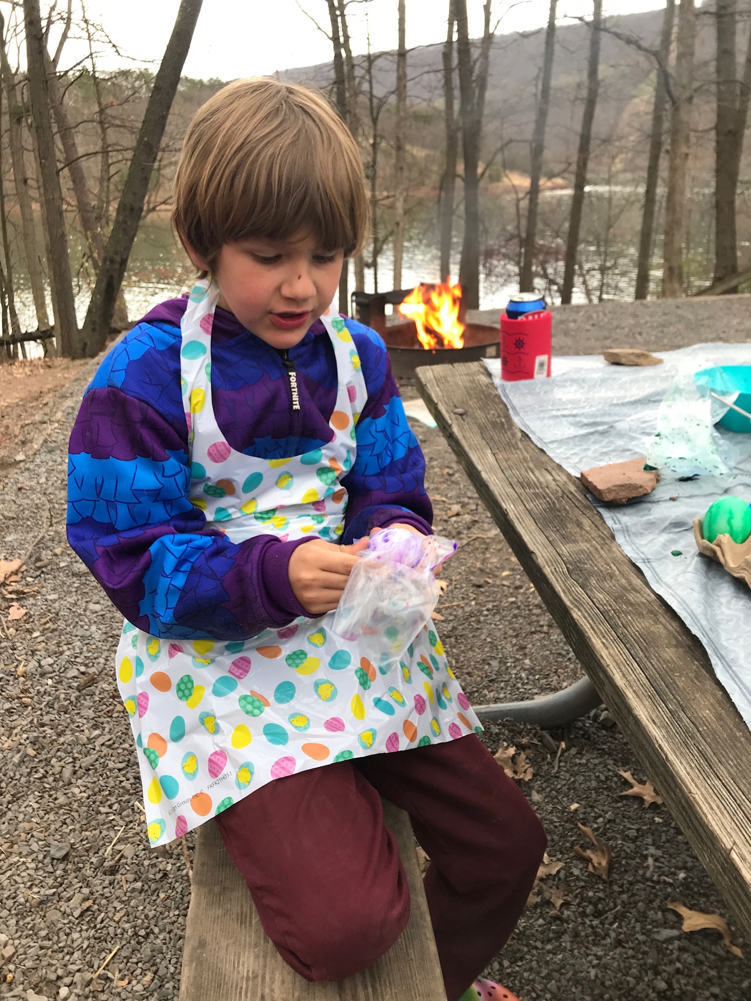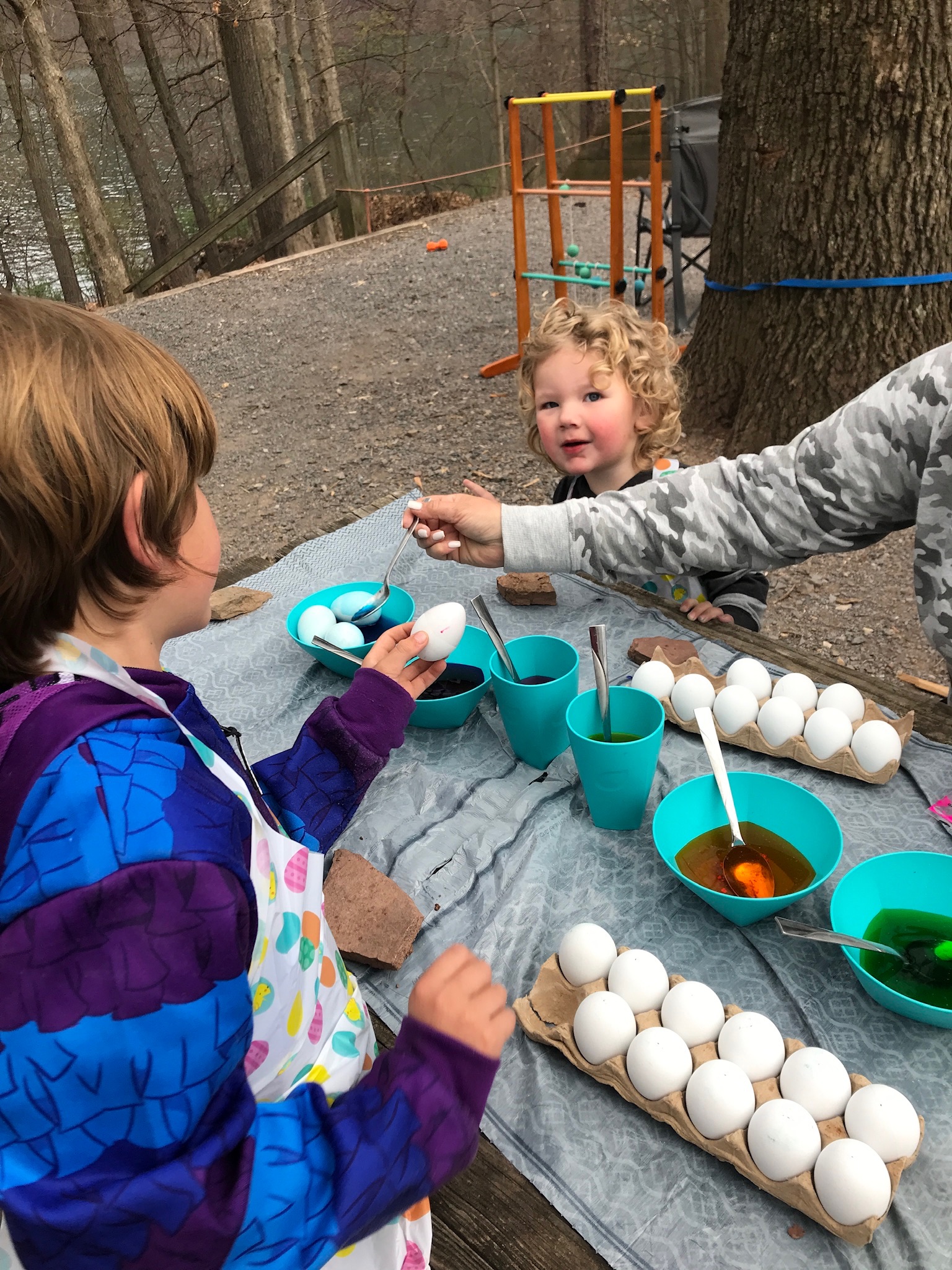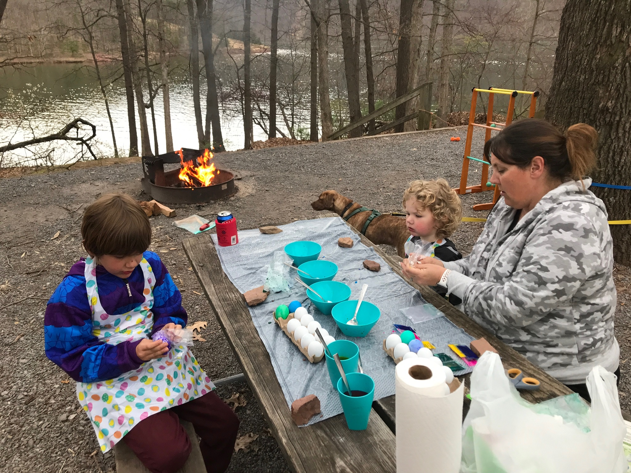Let’s not forget that it was Easter weekend and even though Sunday got off to a cold and rainy start (mixed with some snow flurries), we decorated eggs (Saturday) and had our egg hunt once things warmed up a bit. This was our second Easter camping but the first with Ethan really on the go and searching for his eggs. Both boys had a great time and I’m hoping we can return in the fall which is not only our favorite time of year to camp, but also to ride.